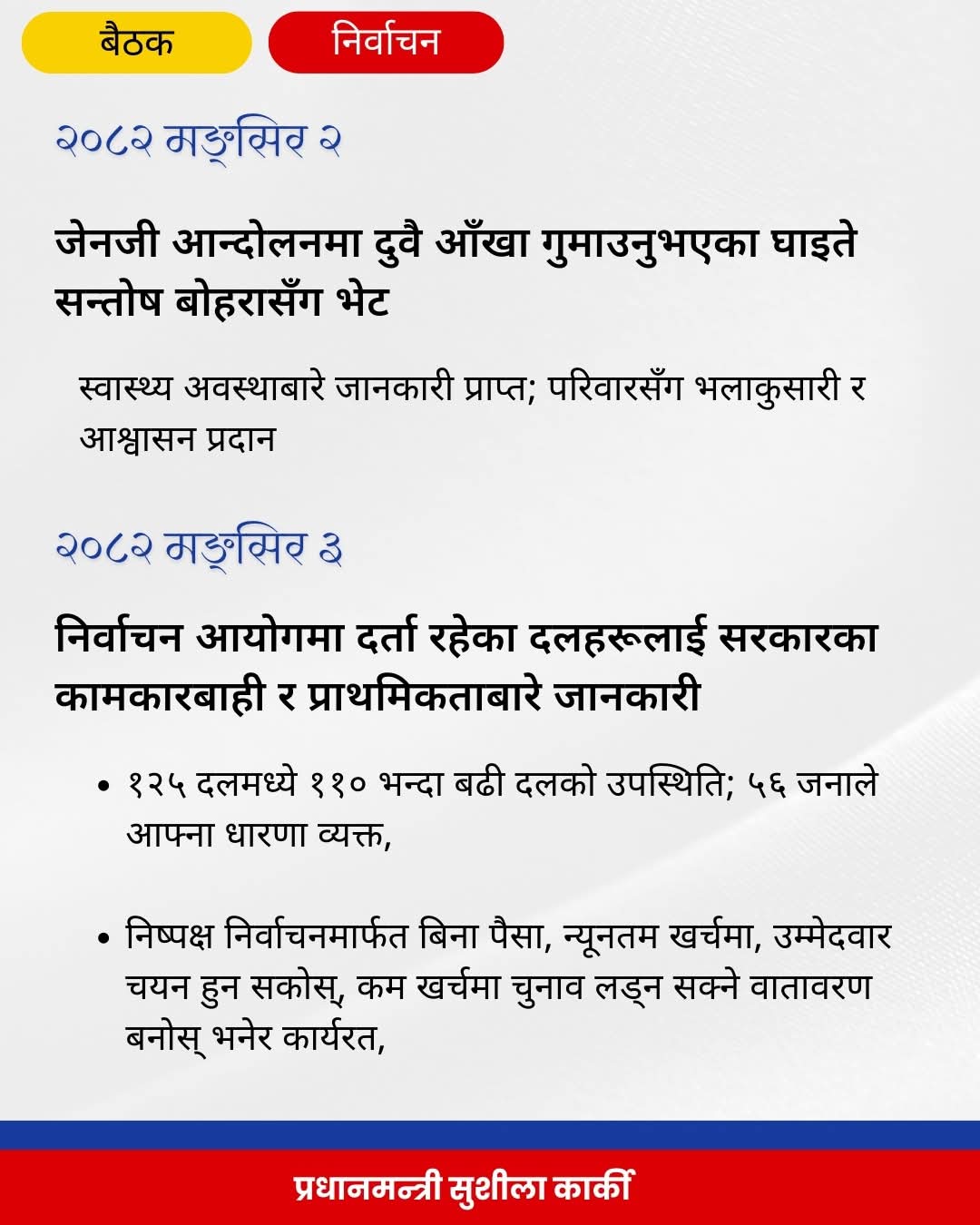 ०७८ मंसिर १ देखि ५ गतेसम्मको अवधि प्रधानमन्त्री सुशील काकीका लागि निकै व्यस्त रह्यो। स्थानीय तह चुनावदेखि सुरक्षा व्यवस्थापन र भ्रष्टाचार नियन्त्रणसम्म, उहाँका गतिविधिहरू सरकारका प्राथमिक विषयसँग प्रत्यक्ष जोडिए।