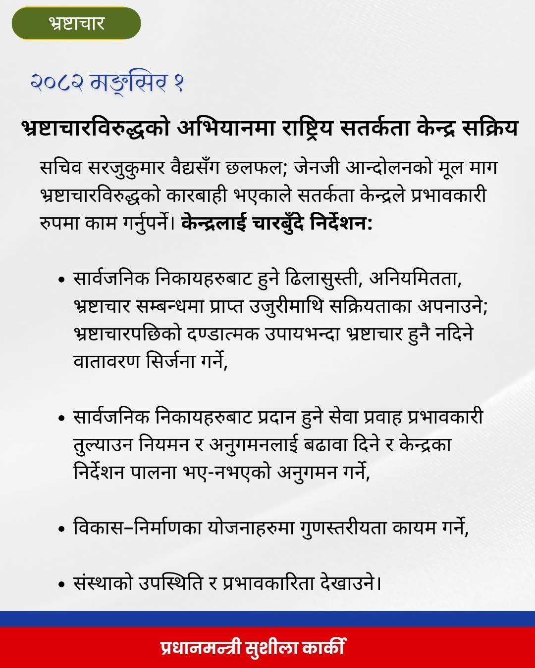 प्रधानमन्त्रीले भ्रष्टाचार नियन्त्रणलाई यो हप्ताको मुख्य प्राथमिकतामा राखे। अख्तियार दुरुपयोग अनुसन्धान आयोगसँग दैनिक समन्वय गरिएको थियो। संवेदनशील विषयमा केही नेतासहित तिनका नातेदारका घरमा भण्डा–माइन जस्तो वस्तु भेटिएको केसमा प्रहरीले तीव्र कारबाही गरिरहेको जानकारी पनि प्रधानमन्त्रीलाई दिइयो।